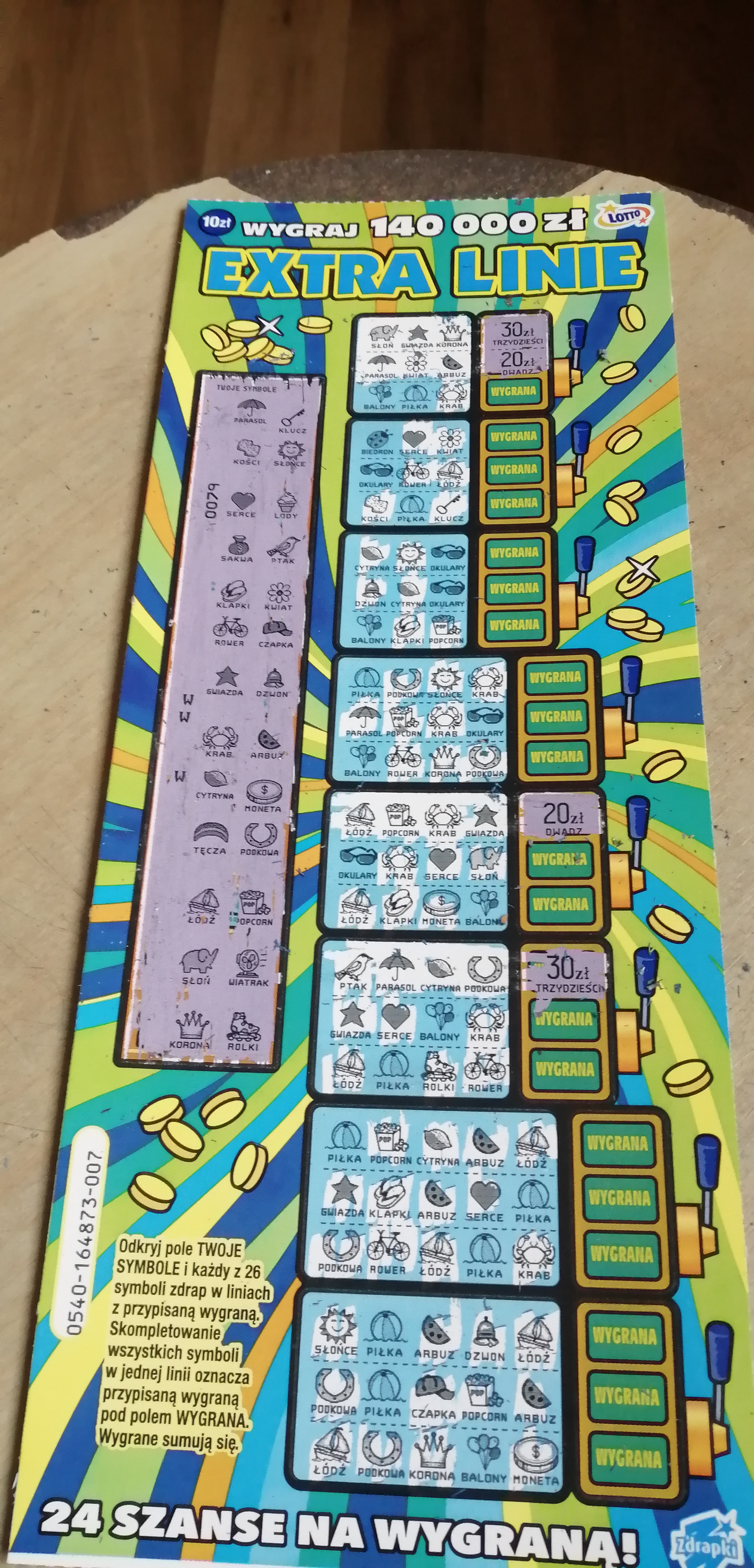 Kupiłem resztę i w 04 było jeszcze 40 zł. Rekord w liniach. Ale mogłem brać 18, 19 i 20, bo jednej 30 brakuje, ale tych zdrapek już nie ma