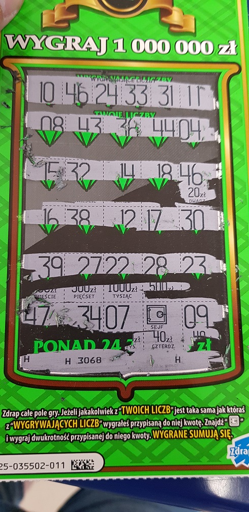 Wziąłem jeszcze dwie sztuki (o zgrozo) i... w jednej 20, w drugiej 40. To zupełnie nie mój budżet zdrapkowy i mam w nich pecha, ale skoro już tak zaszalałem to grzecznie zabieram co ugrałem przy 3 szt w sumie... 20 zl na plus. Może jutro jedną skubnę w innym mieście jak wrócę z urlopu ; )