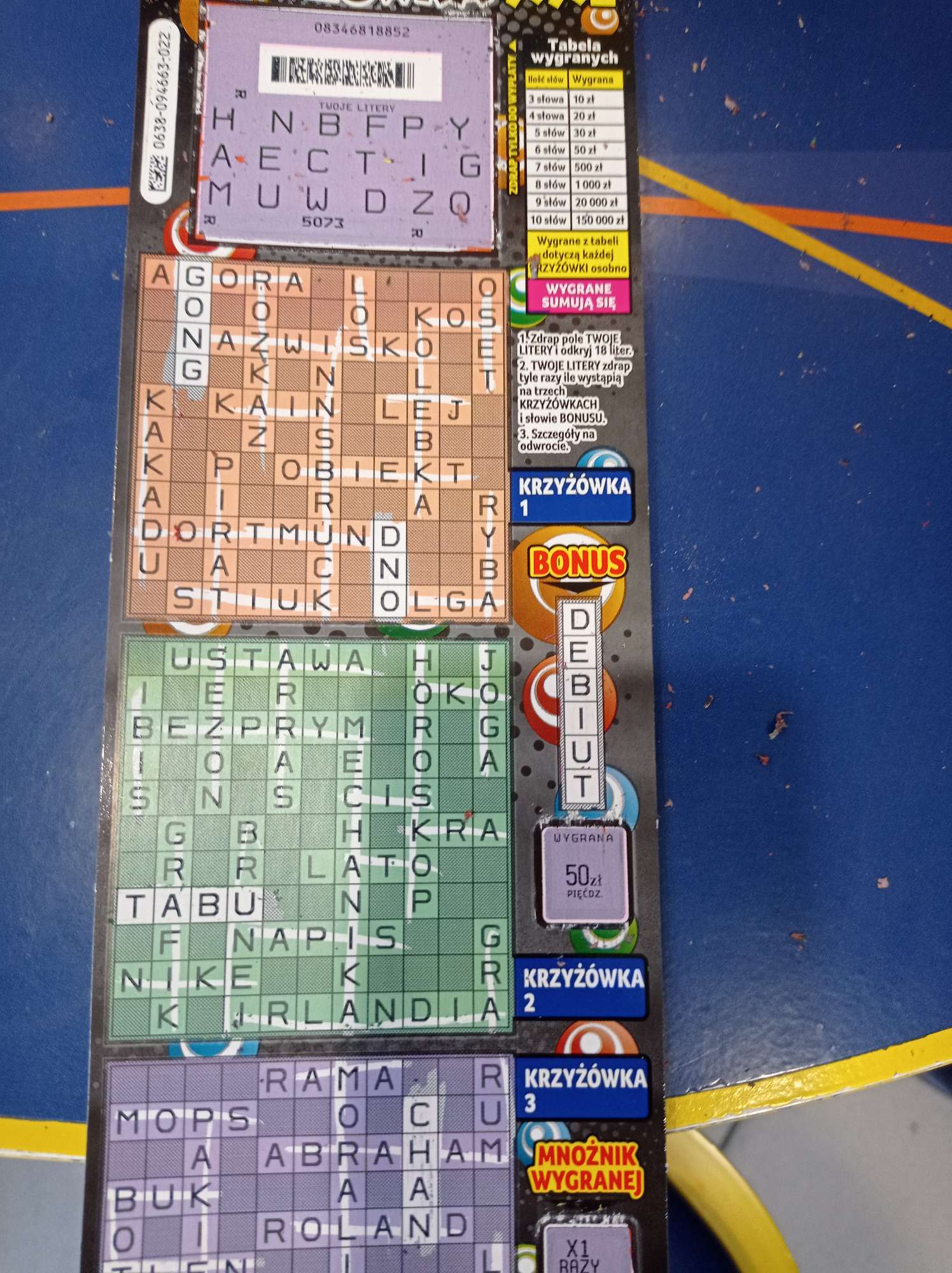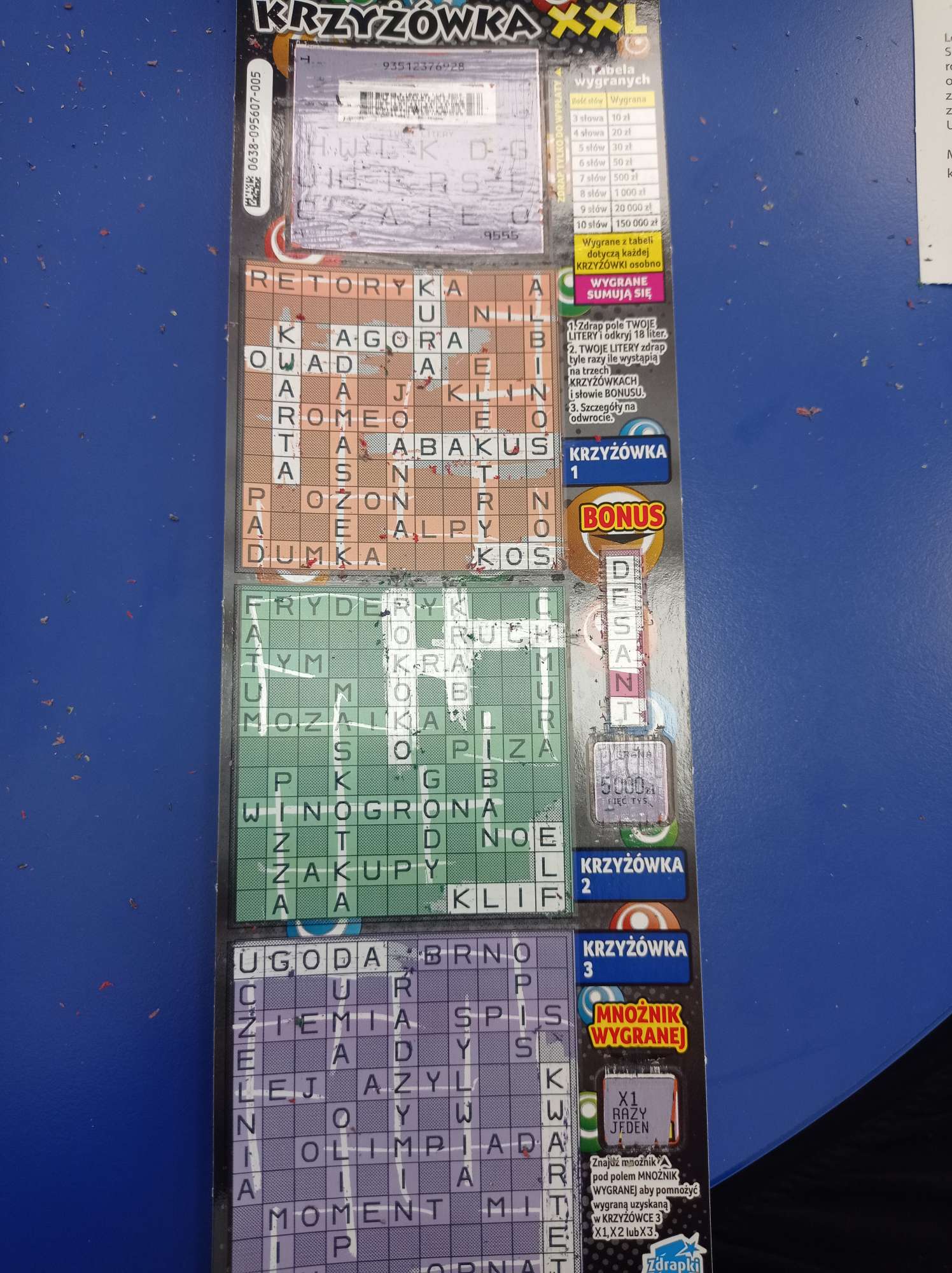 Cały czas czekam na losową w tej zdrapce. Dziś udało mi się trafić 50 zeta w środkowej krzyżówce, I chyba często są pełne zdrapki obok siebie, już kilka razy mi się zdarzyło, że kupując dwie dostawałam dwa kolejne numery i oby dwie były wygrane, czasem 2 x 10 zeta, a ostatnio 10 i 30.