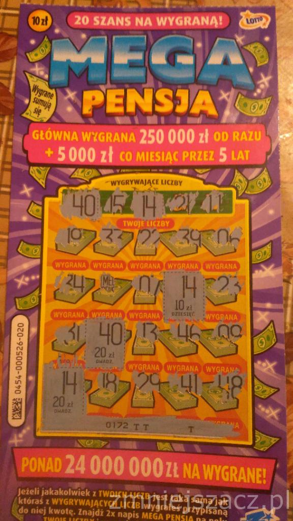 Gratuluję. Dla mnie niestety zepsuli Mega Pensję :/ Czasem wezmę ją z sentymentu ale po pierwsze, idzie mi w niej tragicznie i max co mogę w niej wygrać to 20 zł od wielkiego święta, a dwa, że warstw ścieralna tej zdrapki jest tragiczna. Tęsknie za dawnymi edycjami, gdzie szło trafić 50 i 100 zł, i gdzie przede wszystkim warstwa ścieralna była do zdrapania a nie do zdarcia :/