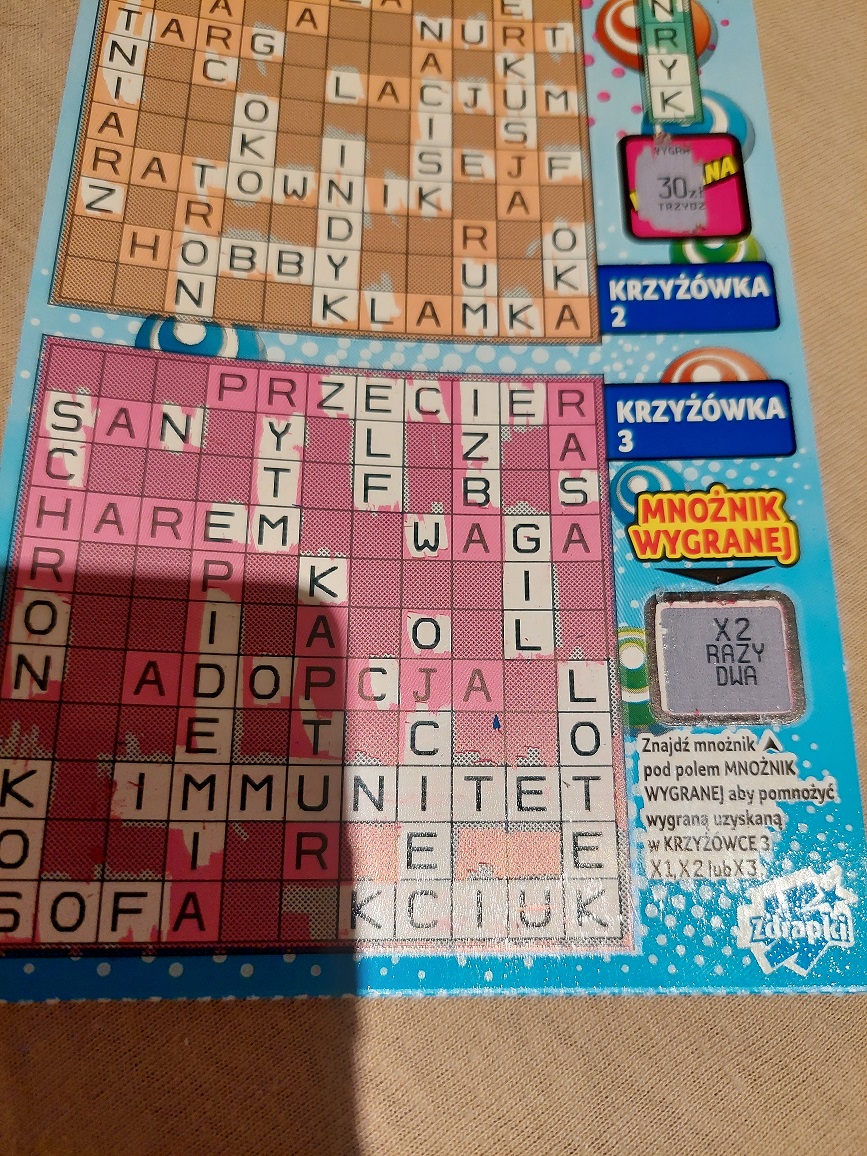 Kupiłem sobie do podrapania dużą krzyżówkę i w pierwszym polu miałem 4 słowa za 20zł (015). Ale przedział już zły 240xxx.