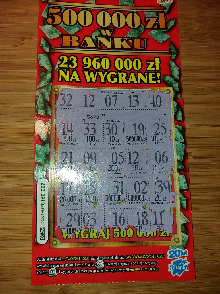 Dzięki. Kupując tą zdrapkę nawet nie wiedziałem, że nie ma w niej już żadnej głównej, ale chociaż jest jakiś plus