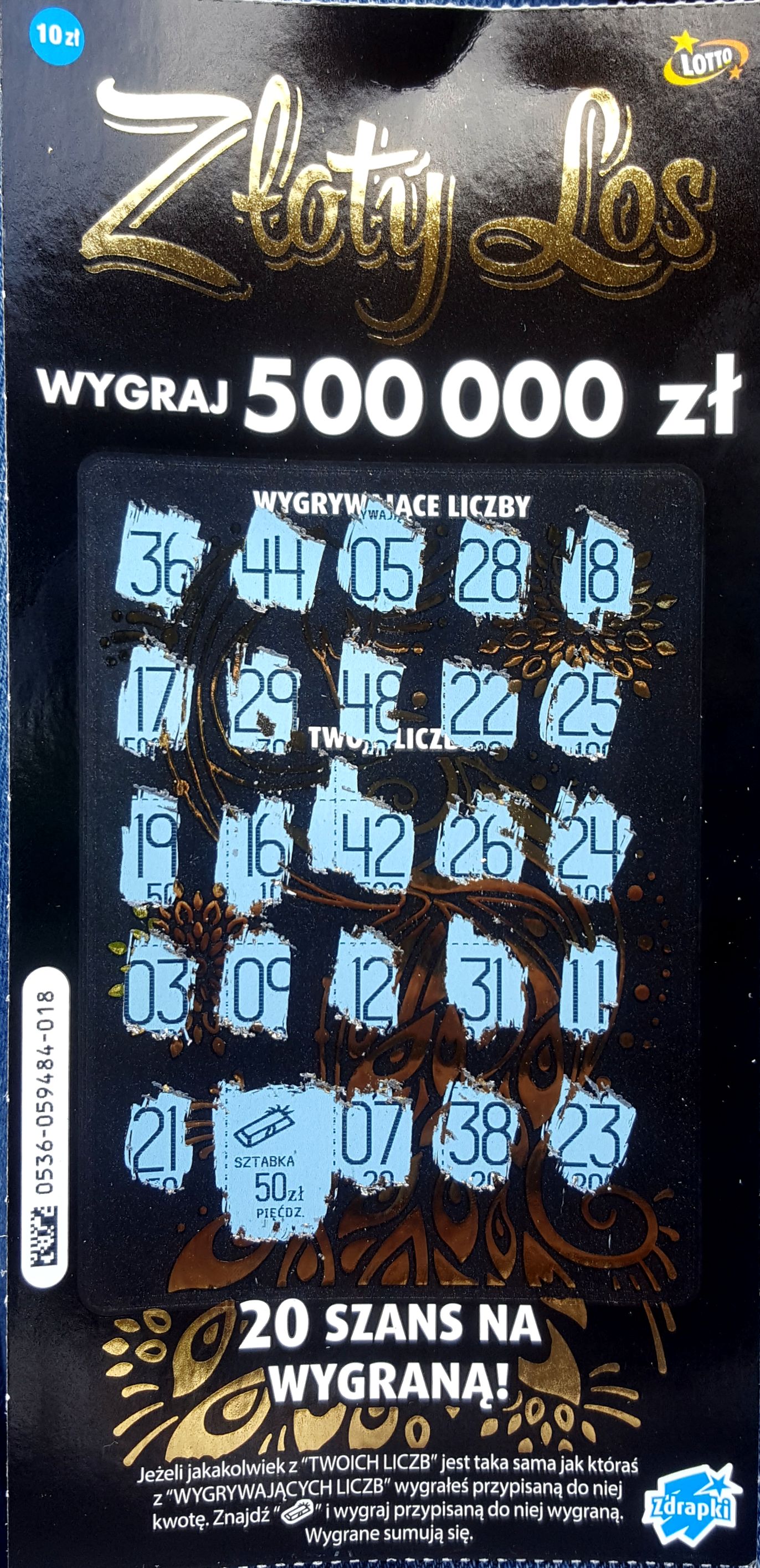 Od tego momentu jeszcze 2 razy skusiłem się na to czarne dziadostwo, oczywiście ze skutkiem takim jak wyżej. Dlatego odpuszczam na jakiś czas tę zdrapkę i koncentruje się na innych za dyszkę, które przynajmniej są ładniejsze wizualnieboobs pisze: ↑23 cze 2020, 23:01Dla mnie jakaś pechowa ta zdrapka. Od początku sprzedaży drapałem może z 5-6 sztuk. Wszystko puste. Tata z okazji Dnia Ojca też dziś drapał Złoty Los i też pustak. Nie przekonuje mnie ta zdrapka, wizualnie też mi się nie podoba no ale będę próbował jeszcze coś w niej ustrzelić.