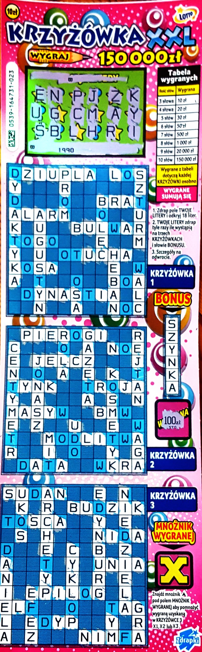 Mi jak dotąd kiepsko idzie. Cały tydzień kupuje codziennie po jednej krzyżówce i wszystkie puste. Już się zniechęciłam do tej zdrapki. Podobnie jest w liniach za 10zł.