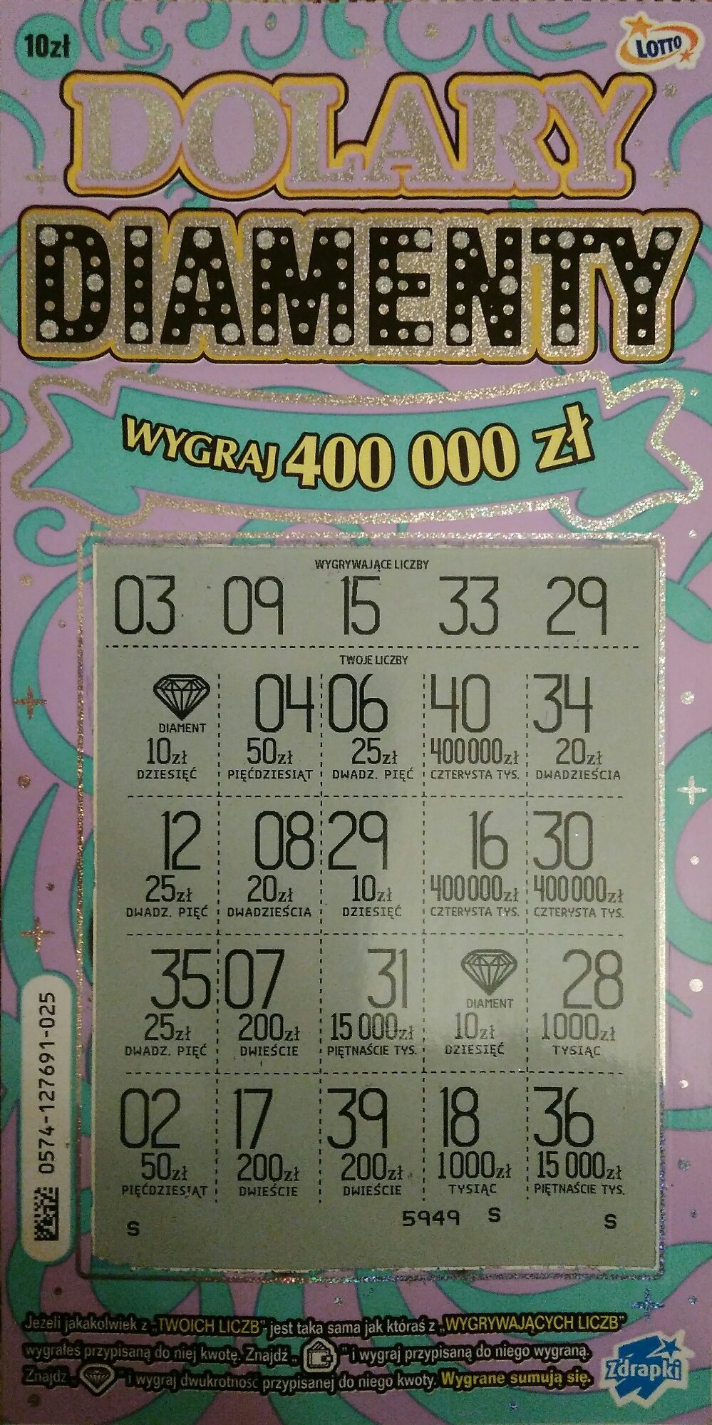 Gratulacje wszystkim wygrywającym. Dla mnie ta zdrapka jest słaba a jej jedyny plus to przyjemna warstwa ścieralna. Jak dotąd kilka sztuk u mnie pustych, jedynie dziewczynie raz udało się wydrapać 25 zł.