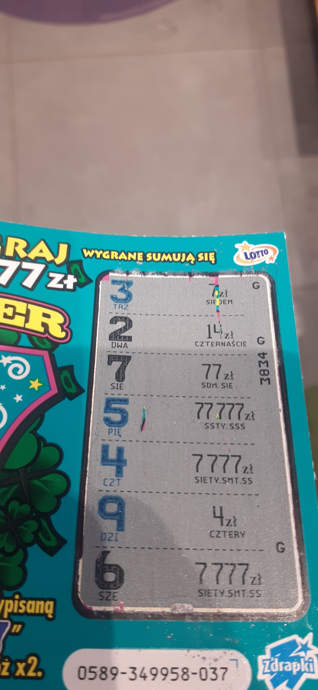 No : ) Niby niewiele, ale jeśli to jedna sztuka ze zdrapkomatu przy okazji zakupów to cieszy - w sumie siedmiokrotność. Szkoda, że 77 zł mi nie wpadło, ale stopień niżej coraz częściej bywa.