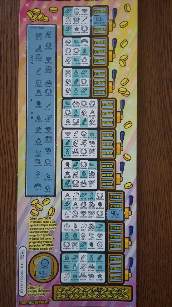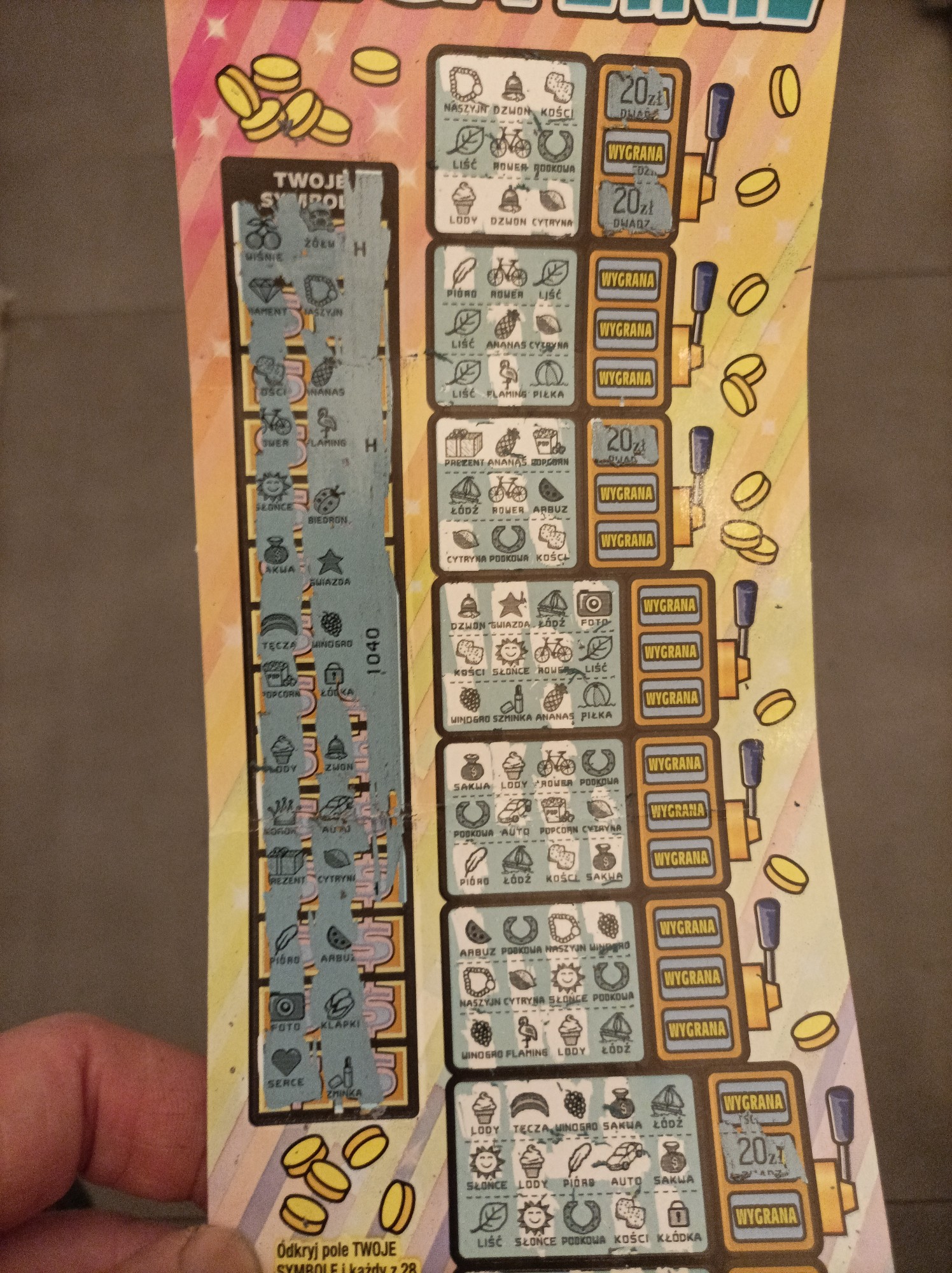 Od poprzedniego postu kupiłem raz 2 ostatnie sztuki z paczki gdzie na jednej było 40zł. Później 1szt która dała 20zł i wymienione na kolejną i pustak. I myślę że na tym poprzestanę, utarg z tej zdrapki mam niezły