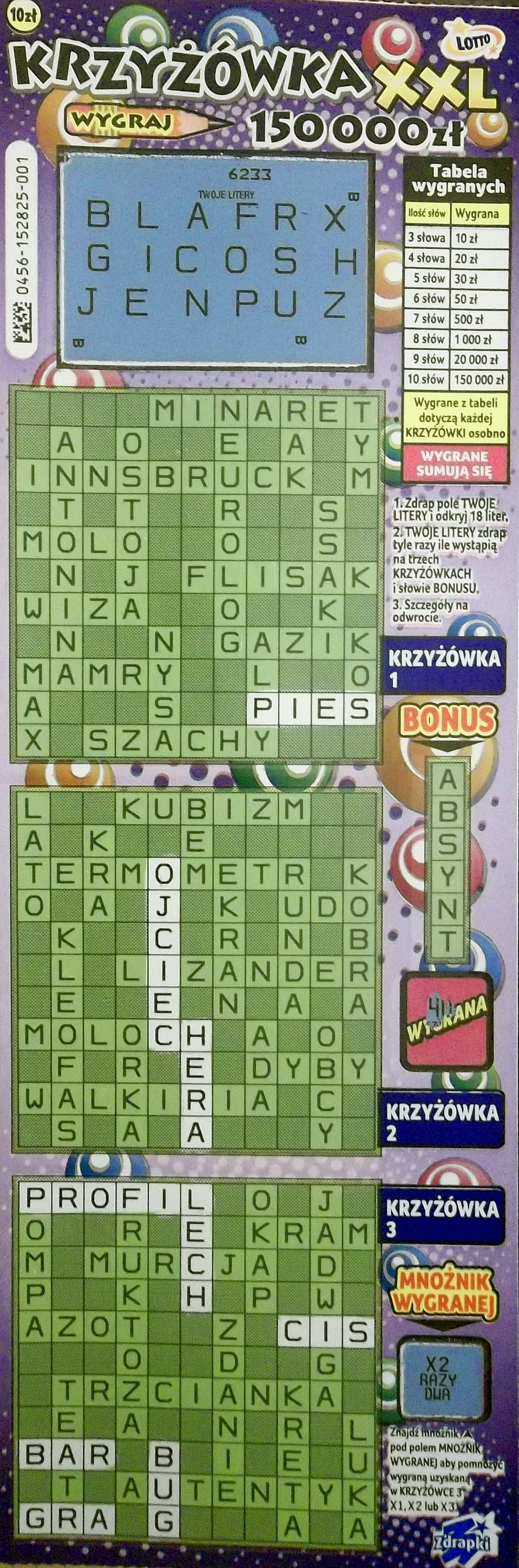 Dzisiaj jedna sztuka ze szczęśliwego zdrapkomatu z nr 003 i 30 zł w pierwszej krzyżówce
