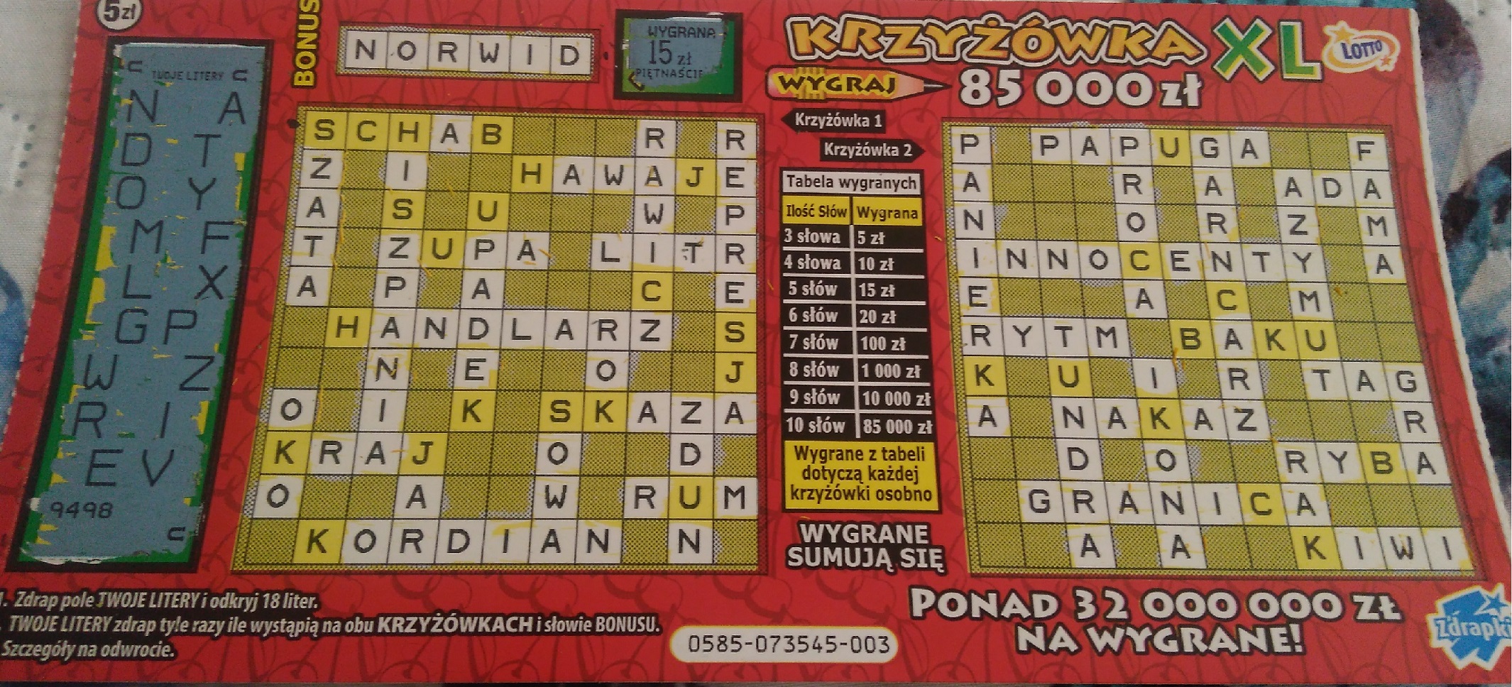 Mój osobisty rekord w tej zdrapce wyrównany - 30 zł tym razem rozlozone - 15 w bonusie i 15 w drugiej krzyżówce