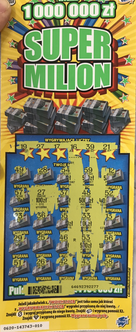 Beznadzieja totalna ja wziąłem 7sztk.pod rząd w jednym punkcie i wszystkie puste.Cwaniactwo tych skompcow nie za granicą nienazarte chamy.To nie są te same zdrapki co były kiedyś