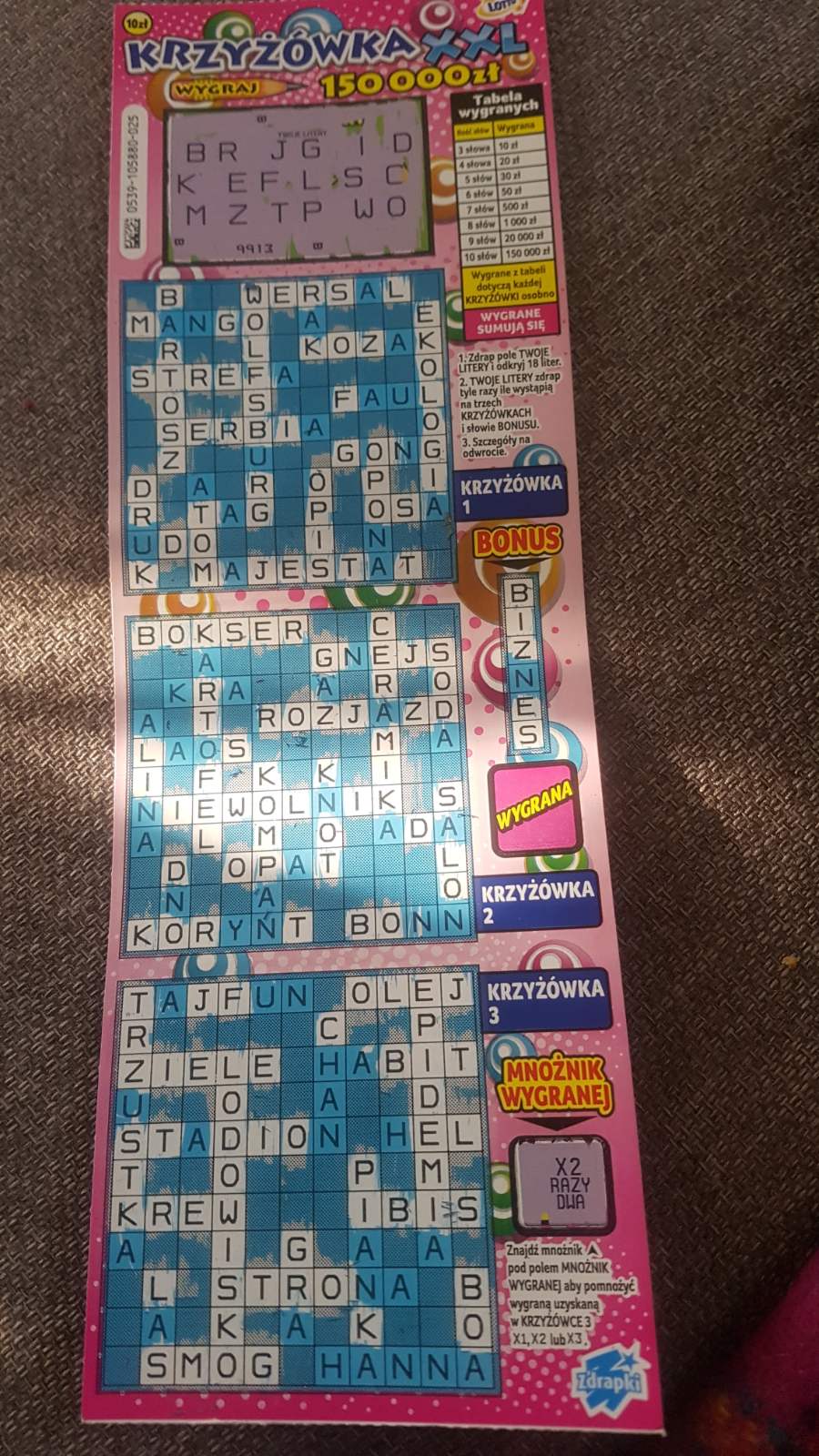 Jak dotąd moja najwyższa wygrana w krzyżówce. Wydrapane 6 wyrazów x2 czyli 100 zł.