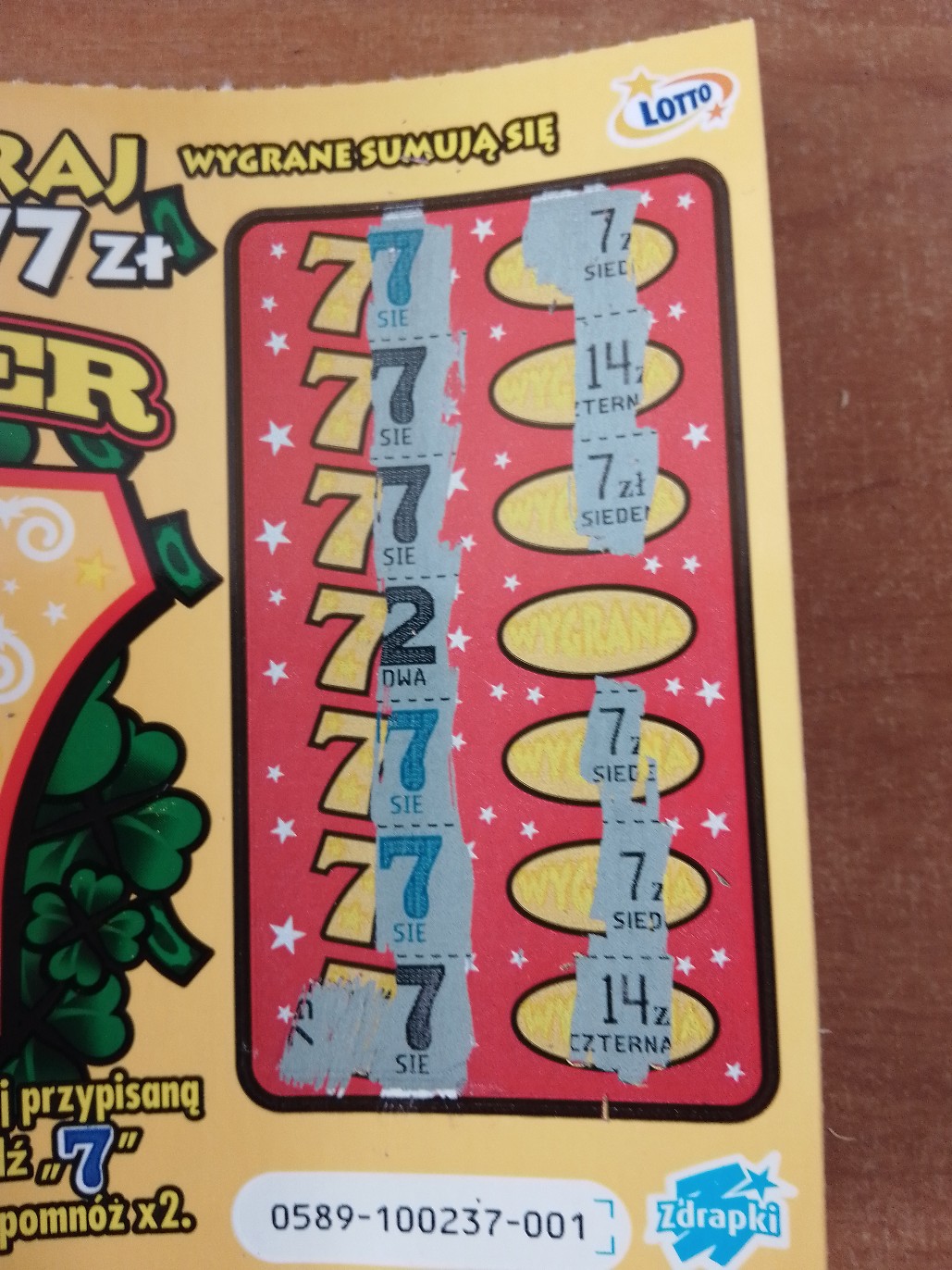 Siódemka coś zaskakująco daje wygrane na forum ostatnio, u mnie wpadło drugie w tej edycji 77zł i to przy jednej sztuce