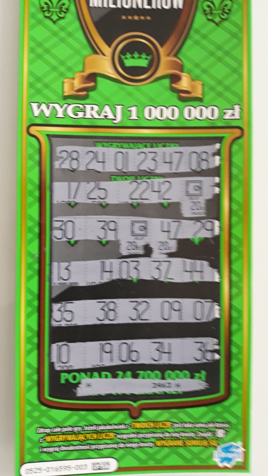 Wszystkie zdrapki podane przez panią kolektorkę, tylko grę o milion wybrałam 15 bo pani otwierała paczkę. Ogólnie wyszło leciutko na minus. Trzeba chyba odpuścić na dłuzej i nagromadzić więcej kasy i energii na kiedyś. Moze Tereska wypuści się kiedyś ze mną i razem zrobimy jakieś wielkie odkrycie systemu