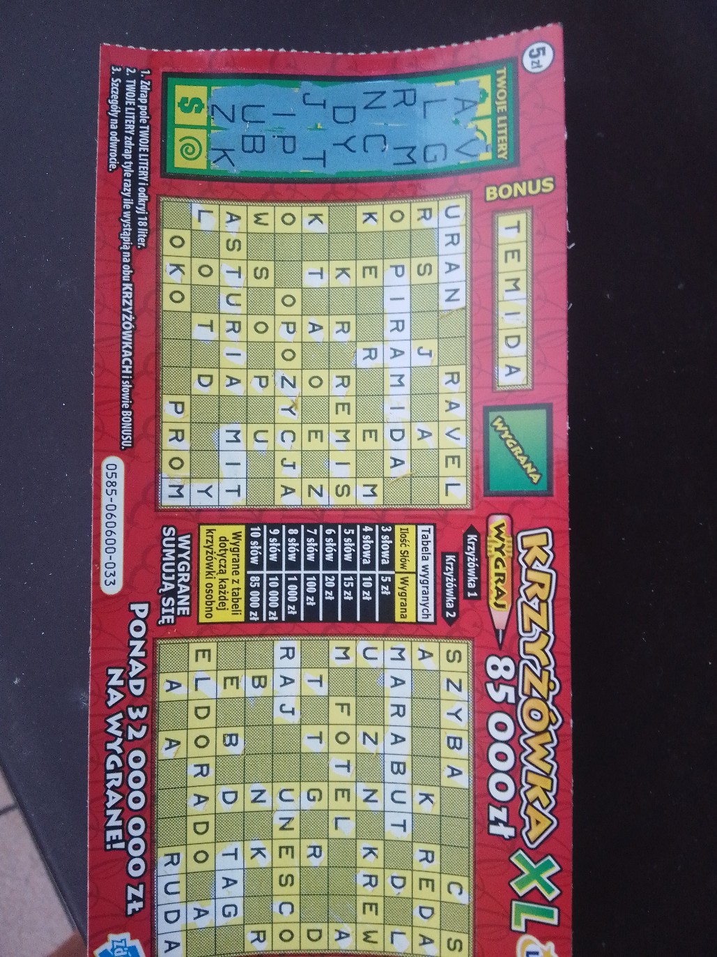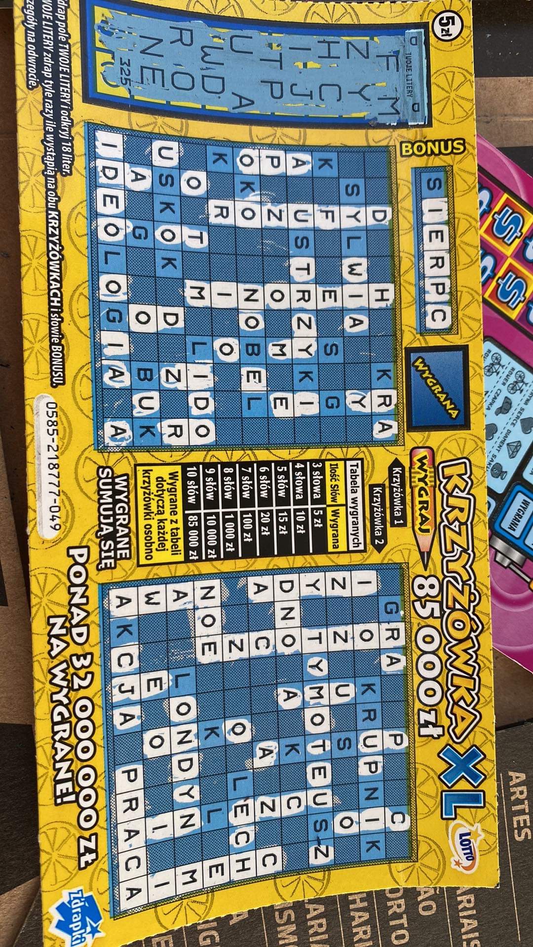 Ależ mam emocjonującą zdrapkę. Jest już 100zł, jeżeli w pozostałych dwóch nieodkrytych literach będzie K - to wyjdzie gł.wygrana
