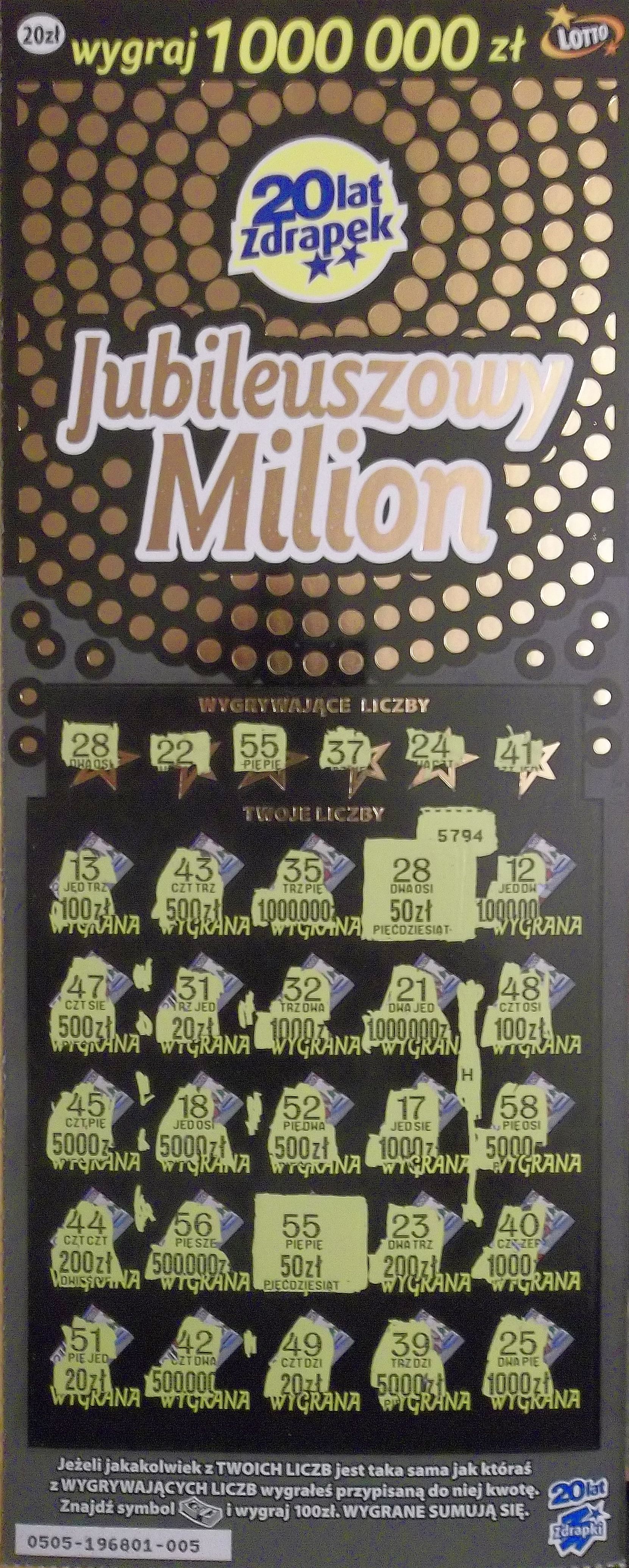 Gratulacje @tereska1975. Ja dzisiaj też zaliczyłem w tej zdrapce 2 x 50 zł w nr 1 i 13. Nie wklejam zdjęcia bo dałem ciała ze zdjęciem. Położyłem jedną zdrapkę na druga i w 13 zasłoniłem liczbę z wygraną 50 zł a nie zdrapywałem całej zdrapy i nie widać literek..