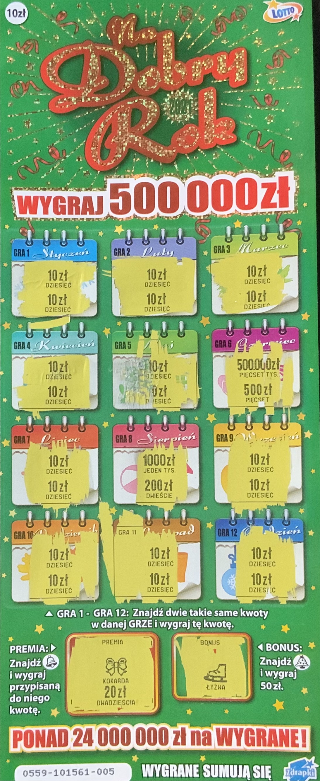 Wczoraj odbierając 500 zł za klub milionerów sobie wziąłem paczuszkę tego nowego dobrego roka bo taka ino ta zdrapka się tak świeciła i zwrot 130 z paczki. I dzisiaj odbierając Pani miała 4 ostatnie tego roka z paczki otwartej i sobie wzielem i w jednej 50 w drugiej 20 a w trzeciej 10 a w czwartej pudło