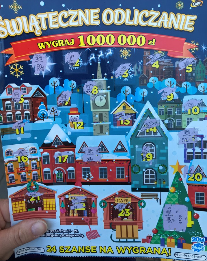 Ja niedawno dostałem 1 szt świątecznej, ale śmiać mi się chciało skąd ono przyjechało. Moja rodzinka (mówimy oczywiście o wlkp) pojechała nad morze i poprosiłem żeby mi zobaczyli za ŚO. Tamtejsza nadmorska kolektorka powiedziała że na jutro sprowadzi tę zdrapkę. I tak było, wiecie skąd przyjechała niepełna paczka? Bowiem z Kielc, a zanim trafiła do Kielc jechała z Warszawy. Także mój los przebył kraj wzdłuż i wszerz zanim trafił w moje ręce. Zdrapka niestety była pusta ale przynajmniej Polskę zwiedziła bardziej niż ja