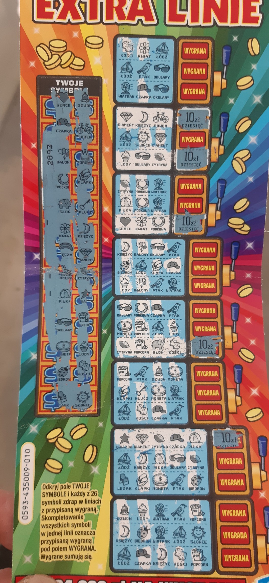 Miałem nr 9,ale dziwna zdrapka. Tylko dwa symbole spalone i to na samym końcu, ale tylko jedna linia. Myślałem że wreszcie trafi się cała zdrapka wygrana, ale niestety. Było 20 zł. Jak na fb widzę że po 2 symbole spalone to mają 500 lub 1000
