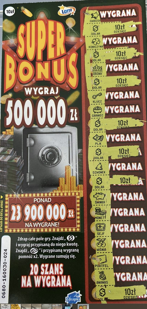 Kupiłem sztukę i było złoto i 10 zł wiec wygrana 20 zł . Warstwa średnia w kierunku słabej.