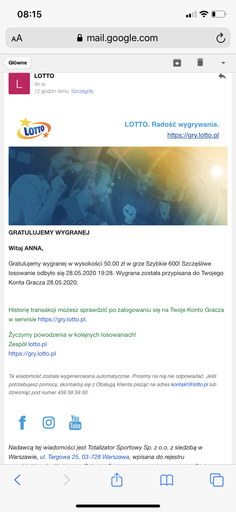Można by rzec, że dobra passa zapoczątkowana w sierpniu zeszłego roku trwa do dzisiaj, z tym, że raz na miesiąc zdarzy mi się coś wysłać czy wziąć zdrapkę i ciągle jakieś 50-tki latają
