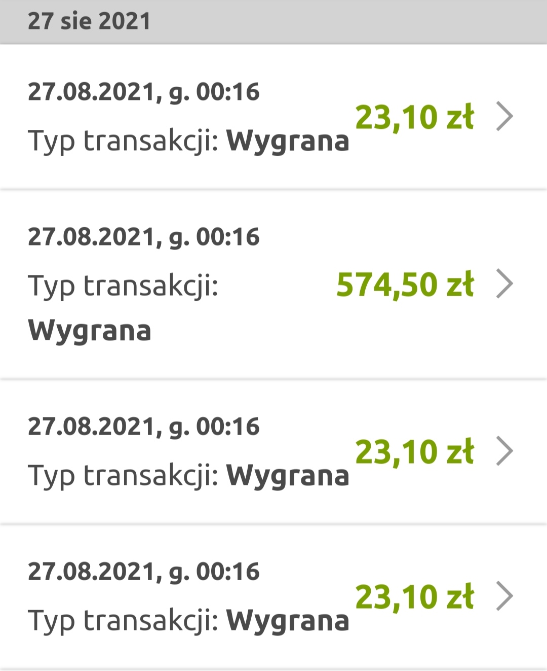 na 14 wysłanych zakładów on-line. Czwórka płatna 574,50 zł, trójka 23,10 zł. W sumie wygrana 713,10 zł