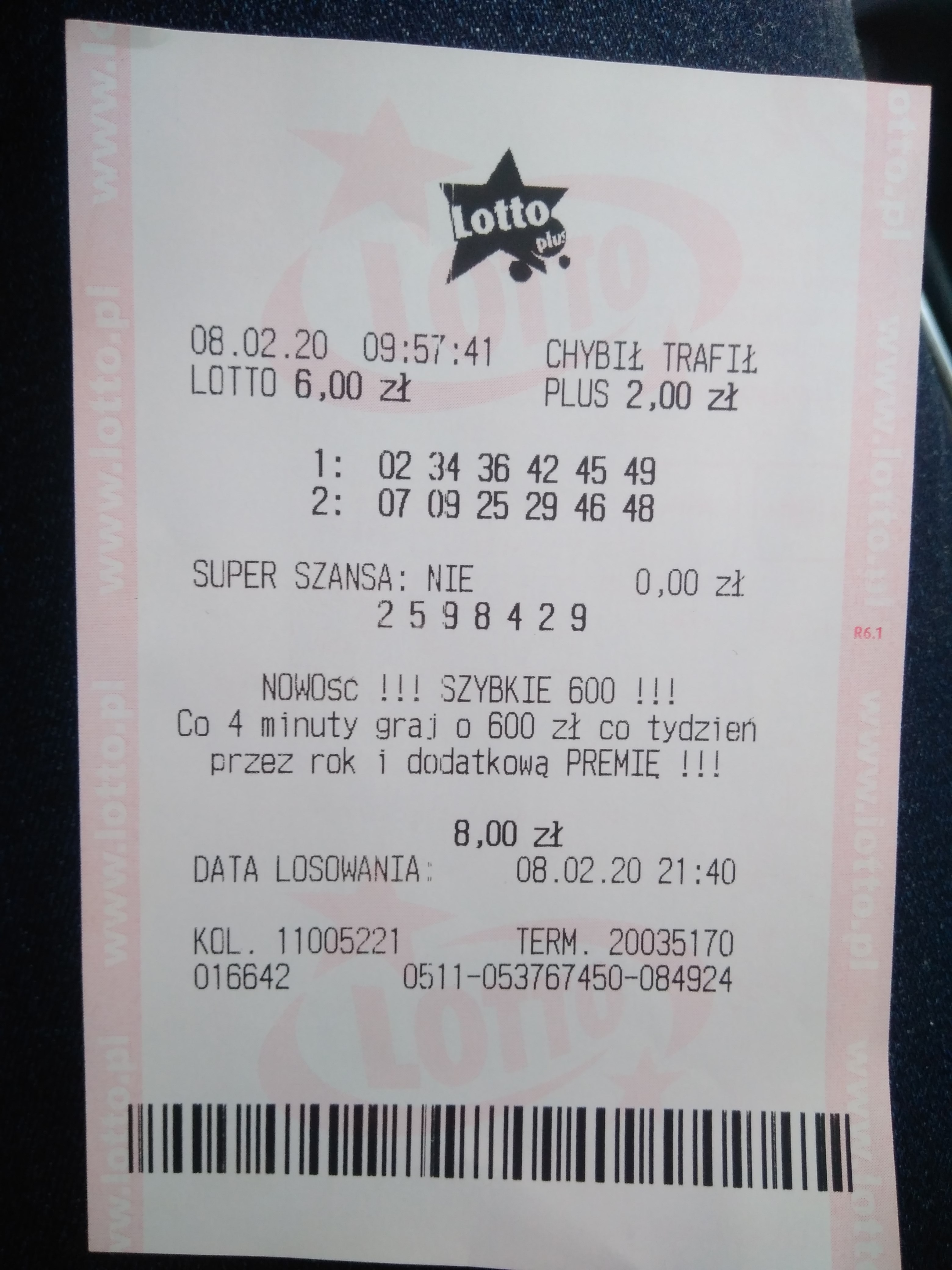 Wielkie graty. Jak Duży to tylko na CT. Brawo brawo !gasss pisze: ↑21 mar 2020, 22:26W poniedziałek odebrałem swoje 5/6 w lotto. 5 warta 5182,60. Na kuponie była jeszcze 3 w ,,+" do wypłaty razem 4674,60. Z racji na sytuację jaką mamy po odebraniu gotóweczki psiknąłem u portiera kasę środkiem dezynfekcyjnym stąd ten zaciek na potwierdzeniu wypłaty.Pozdrawiam Panią z oddziału w Rzeszowie, za miłą rozmowę