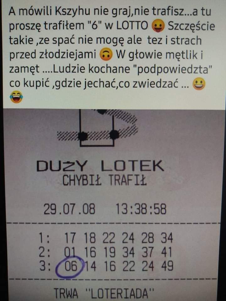 Prawdopodobieństwo trafienia to potwierdza. W mini masz szanse na trójkę 1 do 128 a w lotto 1 do 57 więc w lotto są dwa razy większe szanse na trójkę. Liczb do typowania jest więcej ale też typujesz 6 liczb a nie 5 jak w mini.KrZySiEk8964 pisze: ↑22 wrz 2019, 13:27Ja jak gram to przeważnie jednym, oczywiście z plusem. No i co jakiś czas wpadnie ta trójka w plusie lub w zwykłym. Niestety nic jak wspomniana trójka w życiu nie widziałem. Ogólnie to zauważyłem, że w Lotto szybciej trafisz trójkę jak w takim Mini, gdzie jest mniej liczb, ale to tylko moja opinia![]()