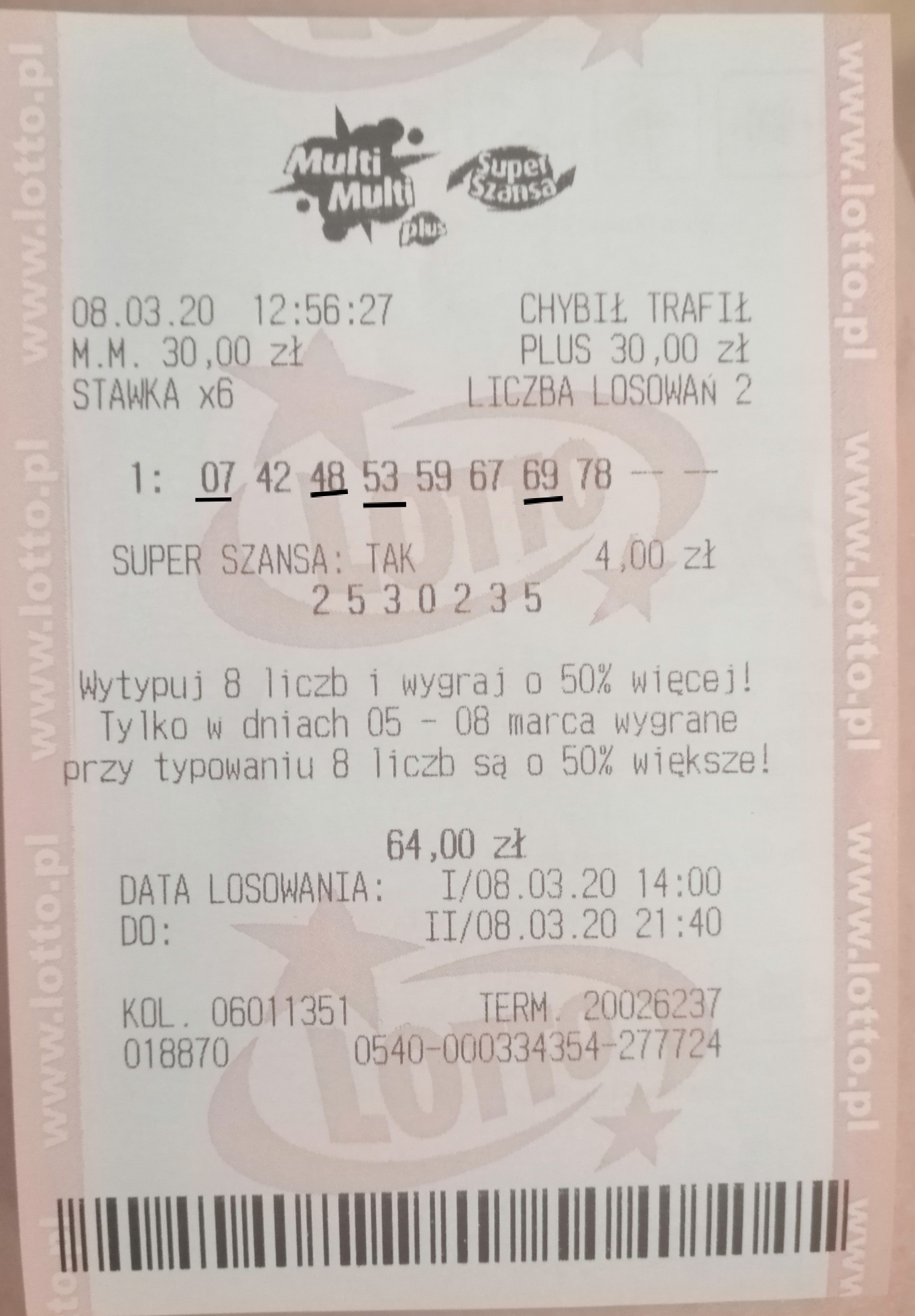Skorzystałam z promocji z okazji dnia kobiet. Wpadło 4/8 z plusem (+50%) ze stawka x6 (chciałam puścić x8, ale na stacji nie można było płacić kartą i było mnie gotówkowo stać na x6). Także do odbioru wygranej 126zl