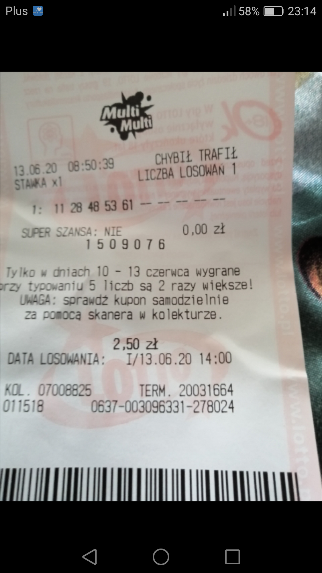 Dziś sobie puściłam na lotto.pl dwa zakłady i w jednym 4/5 wpadło 20zł i obok do 5/5.Wylosowali 44 a ja miałam 45.