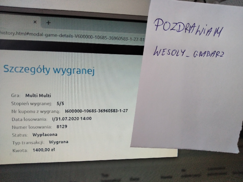 Dziś troszkę wydałem na multi w promocji bo aż 150 zł i choć raz się opłaciło . Miałem 10 zakładów , 10 zakładów na stawce 2 i 10 na stawce 3 bez plusów . Bez stawki udało się trafić 5/5 1400 zł . Ponadto padło 4/5 w stawce 2 - 80 zł ,3/5 - 16 zł i 3/5 na stawce 3 - 24 zł . Podsumowując 1520 zł !!! Oby nie poszły na głupoty