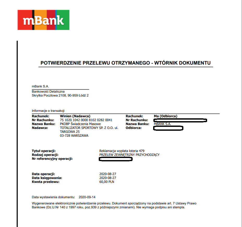 Okazało się, że miesięczny termin wypłaty w dowolnej kolekturze już minął, więc jedynym sposobem na odzyskanie pieniędzy była próba złożenia reklamacji w Oddziale (mamy na to 6 miesięcy od daty zakończenia sprzedaży danej zdrapki).