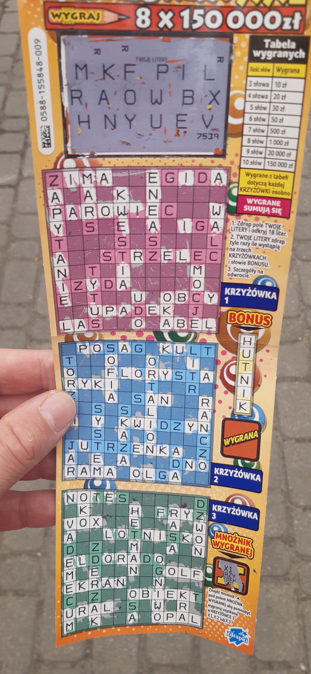 Dzisiaj przy jednej sztuce 40 zł w numerze 24. Jak dotąd to moja największa wygrana w tej odsłonie krzyżówki. Czasami miałam wrażenie, że kupuję z paczki, w której są same pustaki. Jednego dnia trafiłam aż 6 z tego samego sklepu. Może to jakieś przełamanie będzie