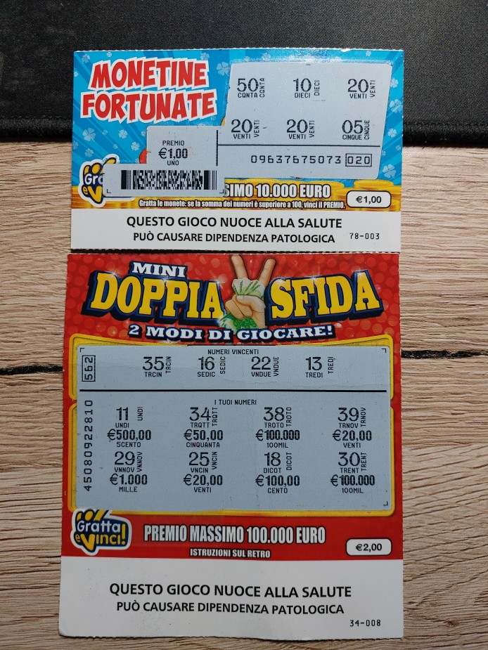 Znajomy z wyprawy na narty przywiózł mi dwie włoskie zdrapki, te z najtańszych - po 1 i 2 EUR. Nieco mnie zaskoczyły inną formułą. W zdrapce za 1 EUR pod warstwą mamy sześć liczb i kwotę. Jeśli suma liczb jest większa niż 100, wygrywamy tę kwotę (trafił się zwrot). W zdrapce za 2 EUR początkowo myślałem, że jest tylko to co u nas, czyli Wygrywające liczby i Twoje liczby. Jednak instrukcja na odwrocie ma dwa punkty. Tłumacz google wyjaśnił drugą opcję: jeśli w obszarze Twoje liczby znajdziemy trzy takie same kwoty, wygrywamy tę kwotę. Dwa różne sposoby na wygraną w jednej, taniej zdrapce. Ciekawe, nie powiem.